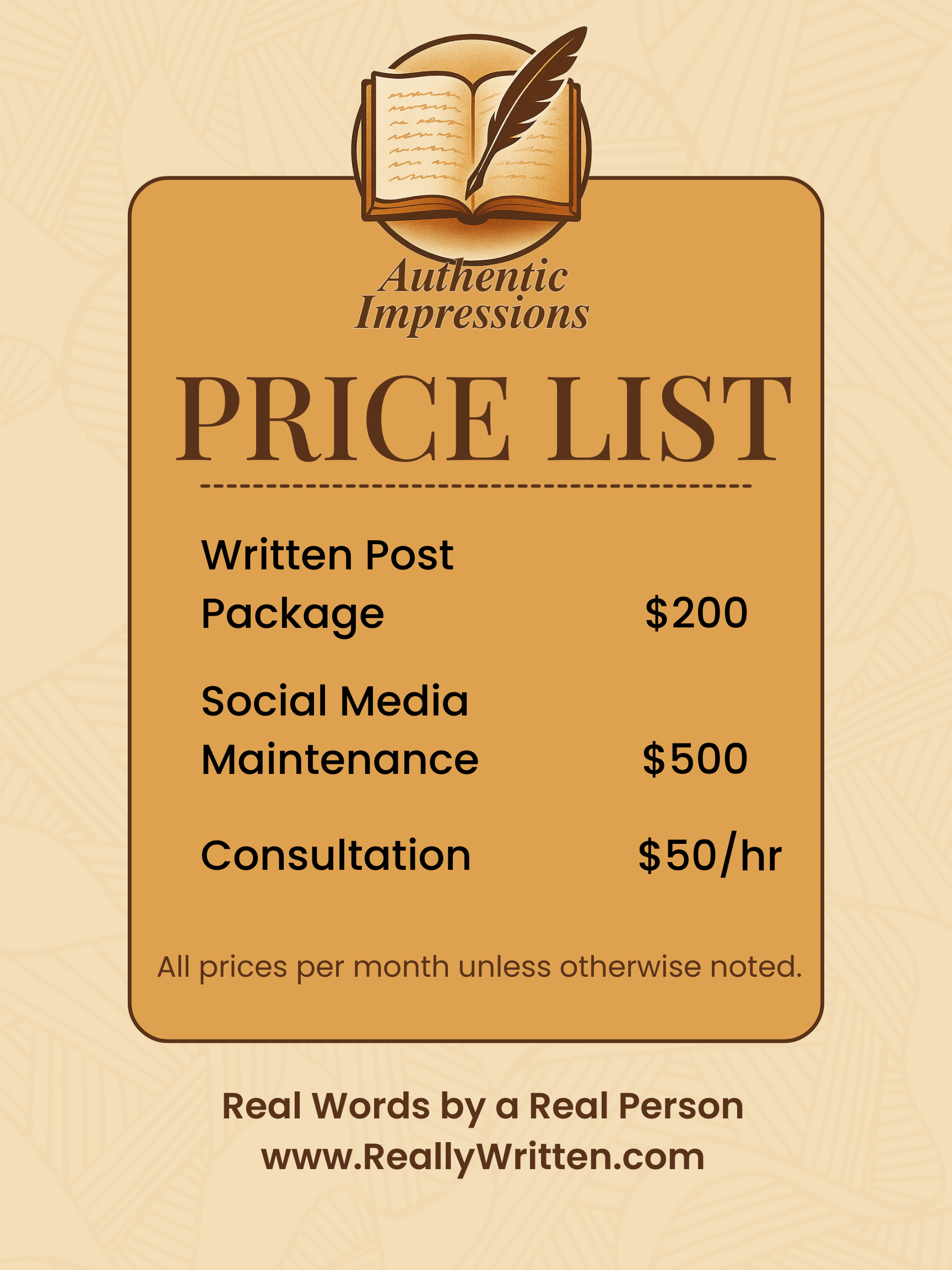 Is your business aiming to make a remarkable online impression? Writing is hard and takes time - something you probably don’t have in abundance. Whether you’re updating your website or enhancing the copy on your social media pages, let Authentic Impressions take the hassle out of writing projects.